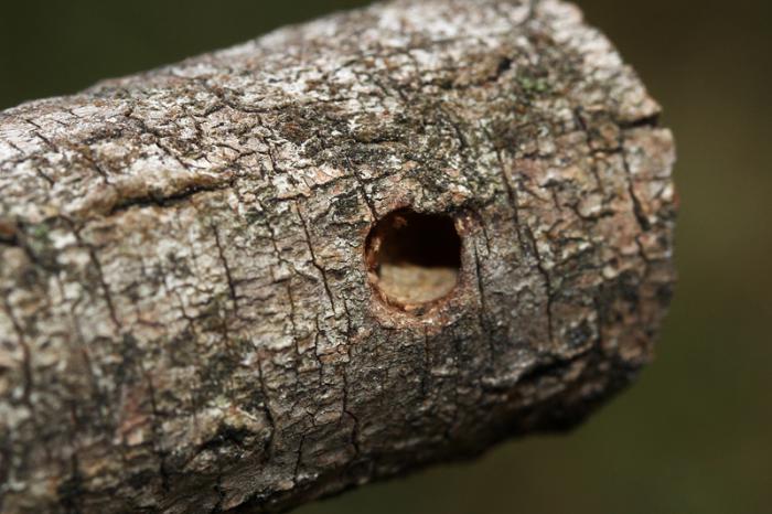 1x Sesia apiformis (hoornaarvlinder) in Populus spec. (populier spec.) (afgezaagde boom)