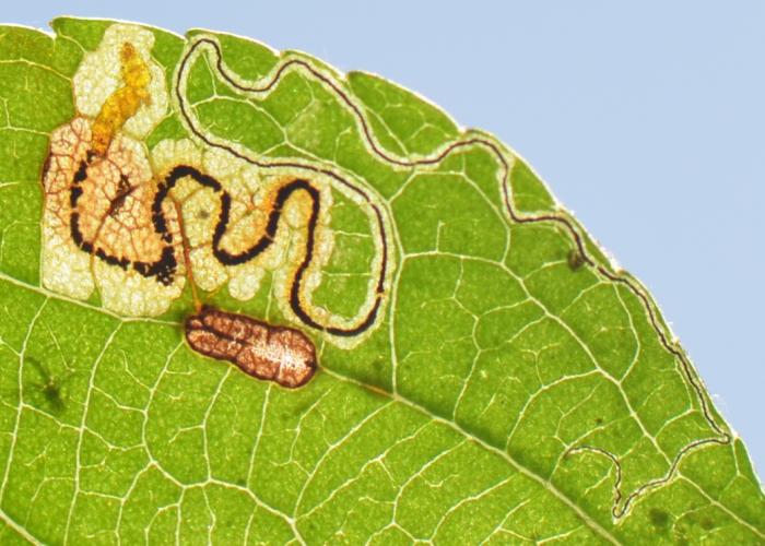 36x Phyllocnistis saligna (wilgenslakkenspoormot) op Salix alba (schietwilg)