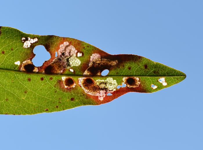 10 mijnen van Mompha raschkiella (tweekleurige wilgenroosjesmot) op Epulobium hirsutum (harig wilgenroosje)